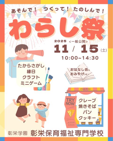 わらし祭当⽇に来校してくださる⽅も、「ちょっと予定が合わなくて学校には⾏けないです」の⽅も、下記のアンケートにぜひご参加ください。